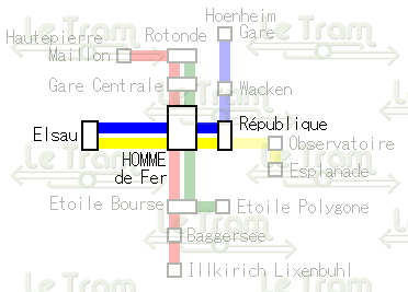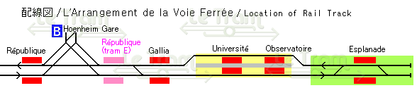 RepubliqueはBとCが分岐する停留所で、Republique広場の南側にあります。ホームのEsplanade寄りに分岐点があります。分岐点は三叉路になっており、Hoenheim Gare方面からEsplanade方面への直通も可能になっています。分岐点のEsplanade寄りにもホームがすでに設置されており、計画中のtram E(BのWacken方面からCのEsplanade以南の新線を経由してAのBaggerseeへ向かう系統)の準備はすでにできています。