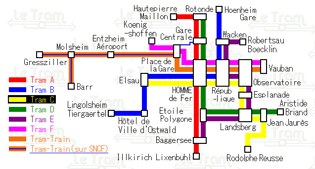 トラム=トラン計画では、郊外のSNCF線との直通系統のTram-TrainとTram Fが新設されます。Tram-Trainは2011年運行開始となる予定です。ストラスブールから西へ向かうSNCFの路線とトラムの直通運転ということになります。鉄道とトラムの接点はSNCFのストラスブール駅となります。まず郊外部ですが、ストラスブールから西へ向かい、ストラスブール空港のあるEntzheim市を経由し(空港駅も作られます)、Molsheim市へ至ります。ここでルートが二つに別れます。西のGresswillerへ向かうものと、南のBarrへ向かうルートの二つです。市内線区間は、ストラスブール駅構内から駅前広場への連絡線を作り、駅前広場からHomme de Ferへ至る軌道を敷設、Homme de Fer手前からC線のルートでObservatoileまで至ります。現在の予定ではObservatoileから500mほど分岐したVauban広場で終点となります。ここから東へ延伸してケール、さらにDBへ乗り入れてオッフェンブルクまで乗り入れる構想もあるようです。ただし、この分岐線にはもう一案あり、Observatoileからの分岐線は造らず、Tram-Train、Tram F双方ともRepubliqueからE線のルートでRobertsau Boecklinへ至るルートと言う案もあります。